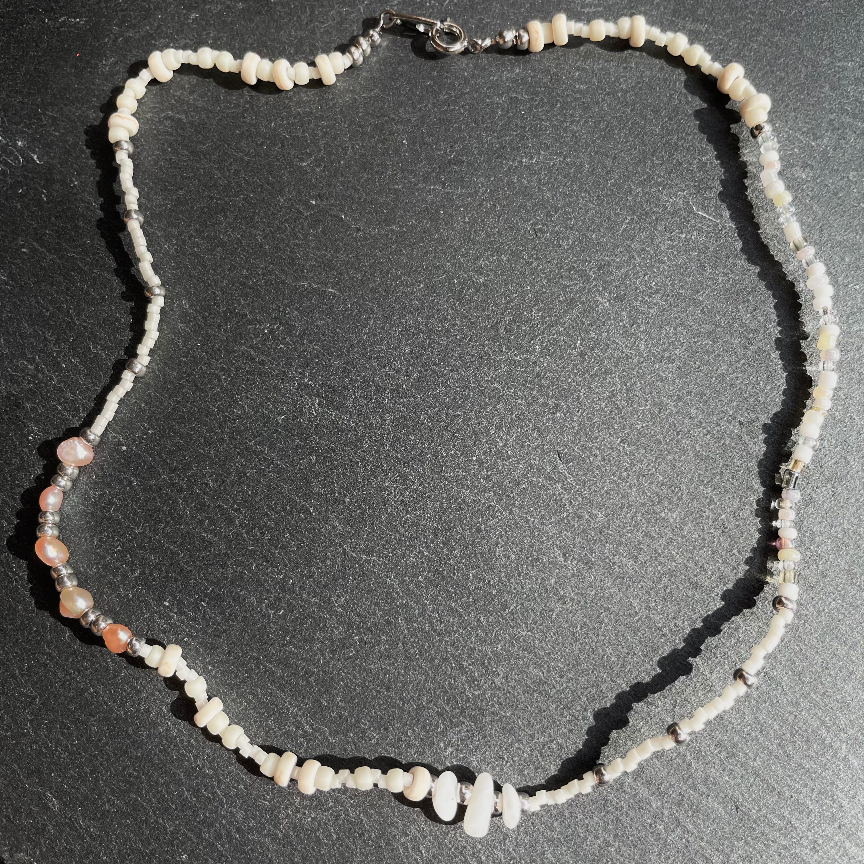 砂浜の様な色々な種類の白と、ピンクのパールで作ったネックレスです。