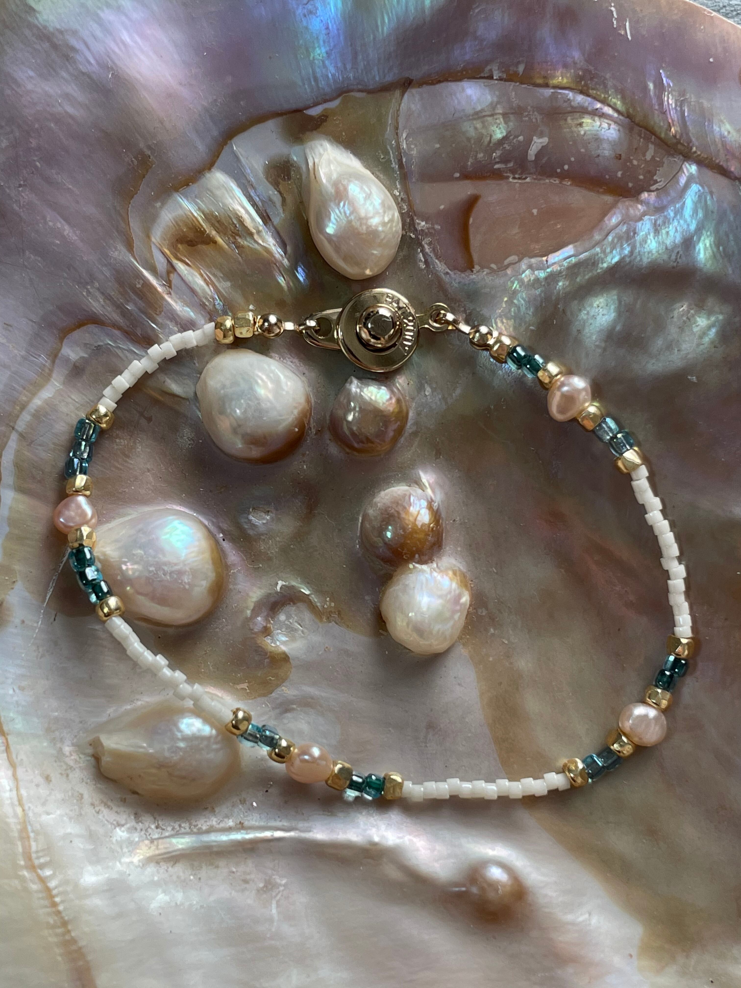 極小のしろに水色とピンクパールをゴールドで仕上げたブレスレットです。