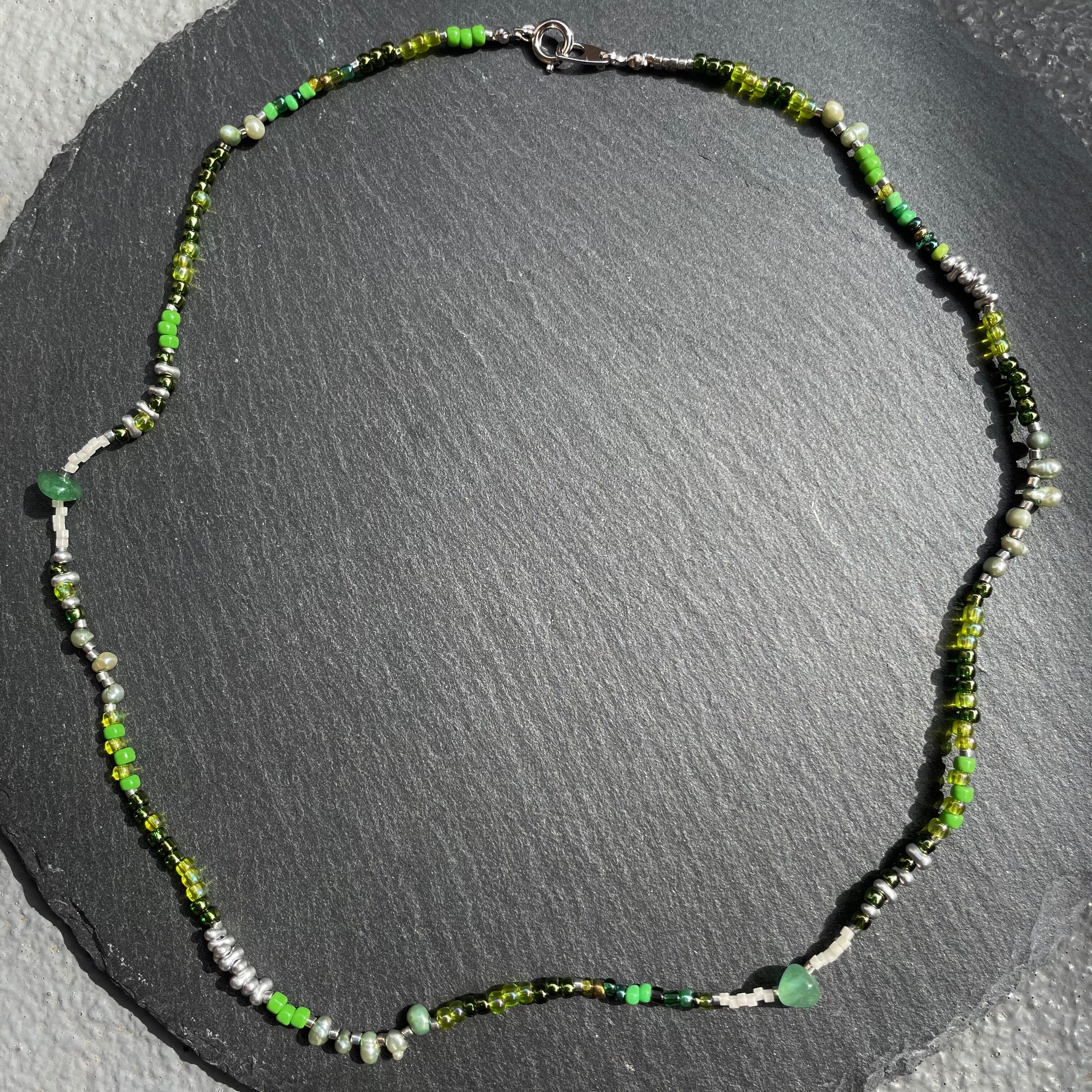 様々な緑のビーズ、淡いみどりのパールを織り交ぜたネックレスです。