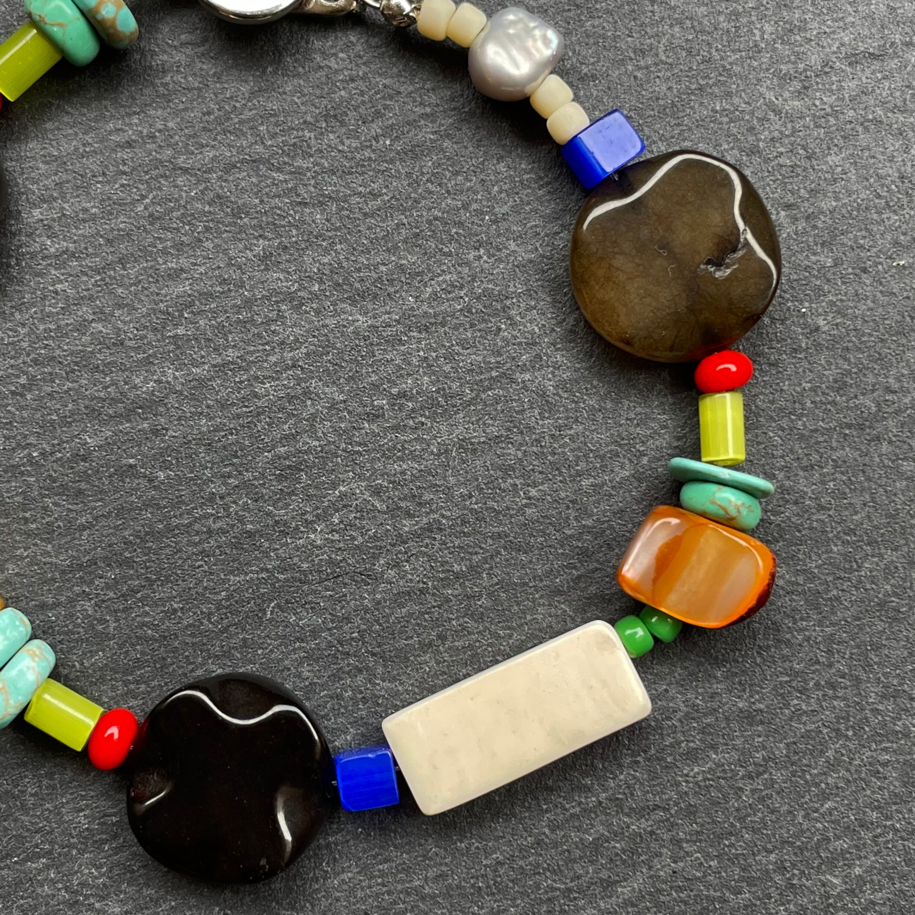 マザーオブパールという貝殻(殻の部分)からできたものや、赤珊瑚、キャッツアイ、ボーンビーズ(骨)などを使っています